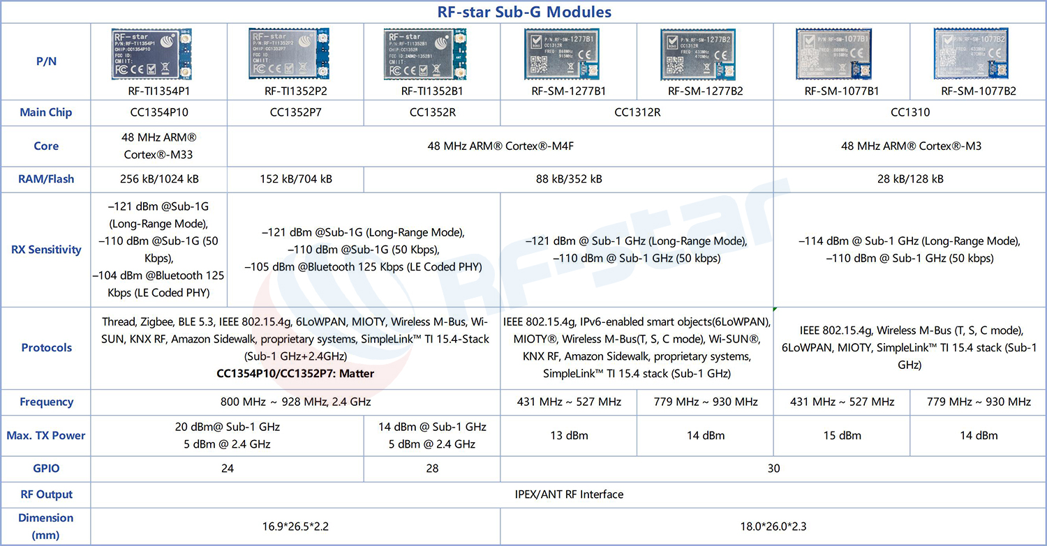Algunos módulos Sub-G de RF-Star admiten funcionamiento simultáneo en modo dual (2,4 GHz + Sub-G) y son compatibles con diversos protocolos de comunicación, como Wi-SUN y protocolos propietarios. La misma plataforma de hardware se adapta a las necesidades de diferentes mercados y aplicaciones, y además ofrece amplio margen para futuras actualizaciones de producto y ampliación de funcionalidades.
